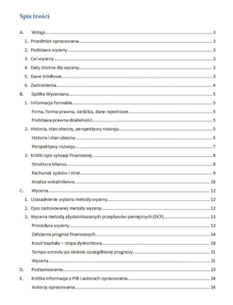 Wbrew powszechnej opinii wycena to nie tylko kwota lub przedział wartości. Profesjonalna wycena to proces, którego podsumowaniem jest obszerny raport. Obok prezentujemy przykładowy spis treści takiego przygotowywanego przez nas raportu w przypadku prostej wyceny przedsiębiorstwa wykonanej tylko jedną metodą (DCF).